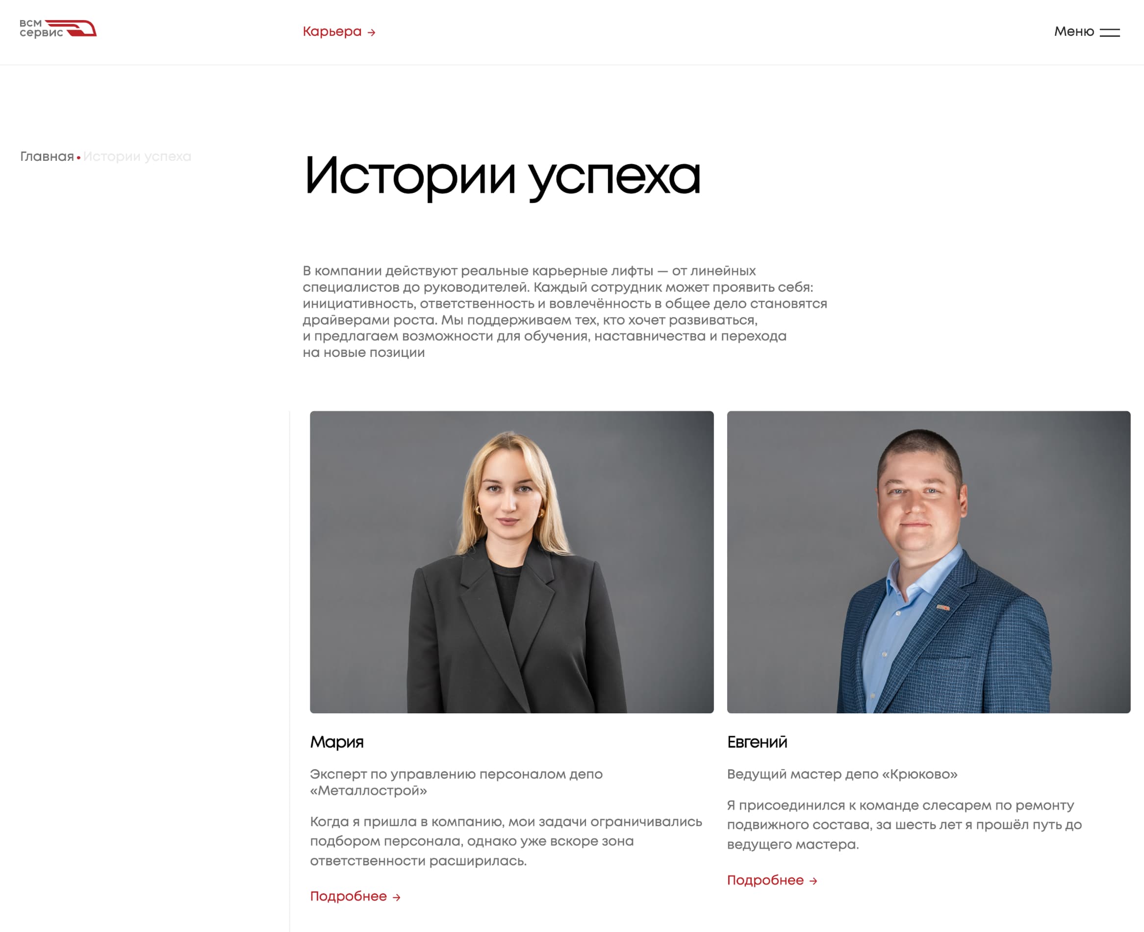 Раздел «Карьера» с описанием вакансий, условий и историй успеха сотрудников.